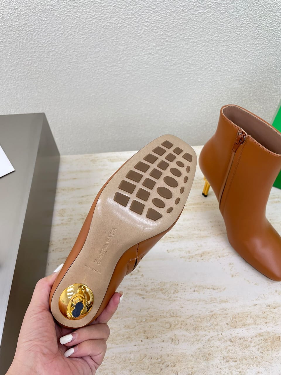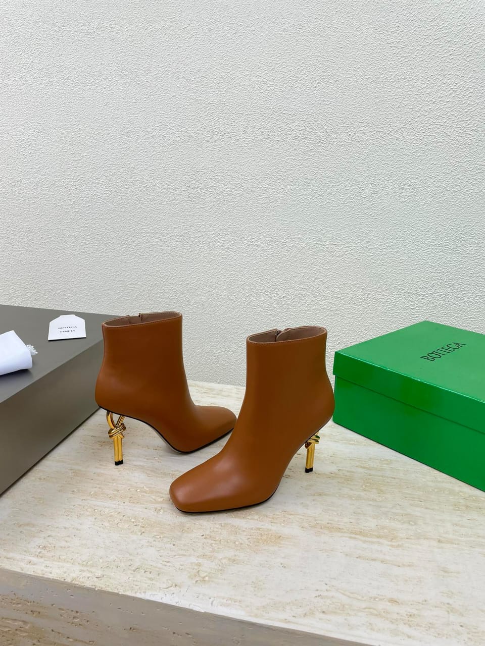 Ankle boot with gold finished metal knot heel. Realised in smooth calfskin with a leather outsole.