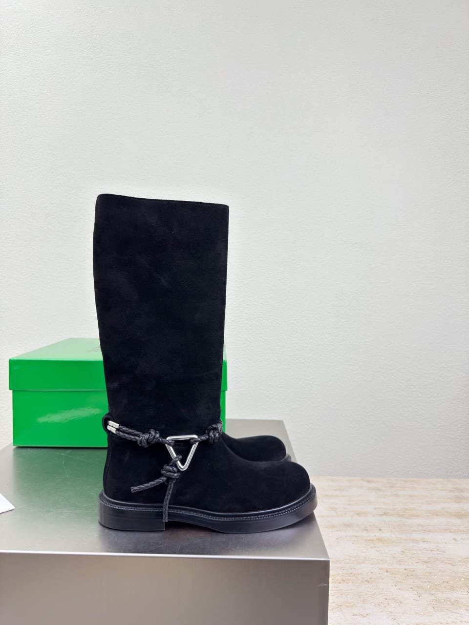 Knee high boot in suede calfskin leather with coaxial detailing and signature metal triangle.