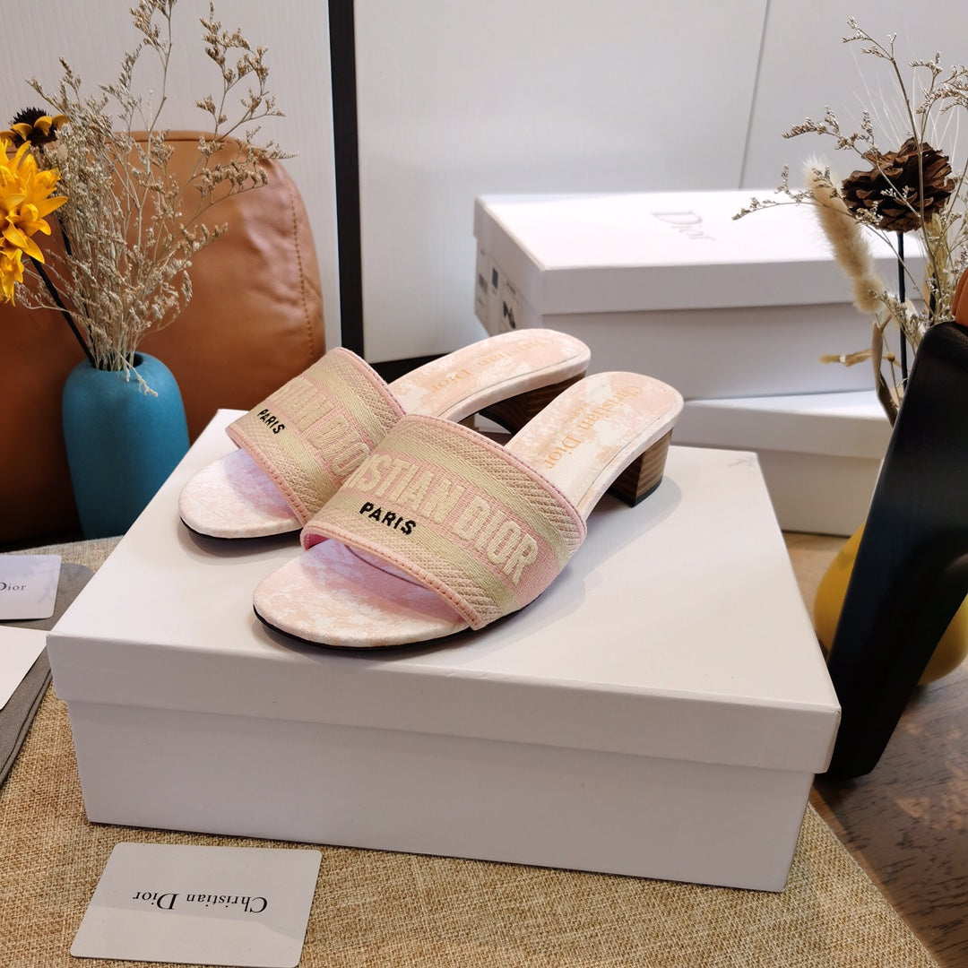 These slides feature a pink embroidered "Christian Dior Paris" signature on the upper strap and a matte leather insole.