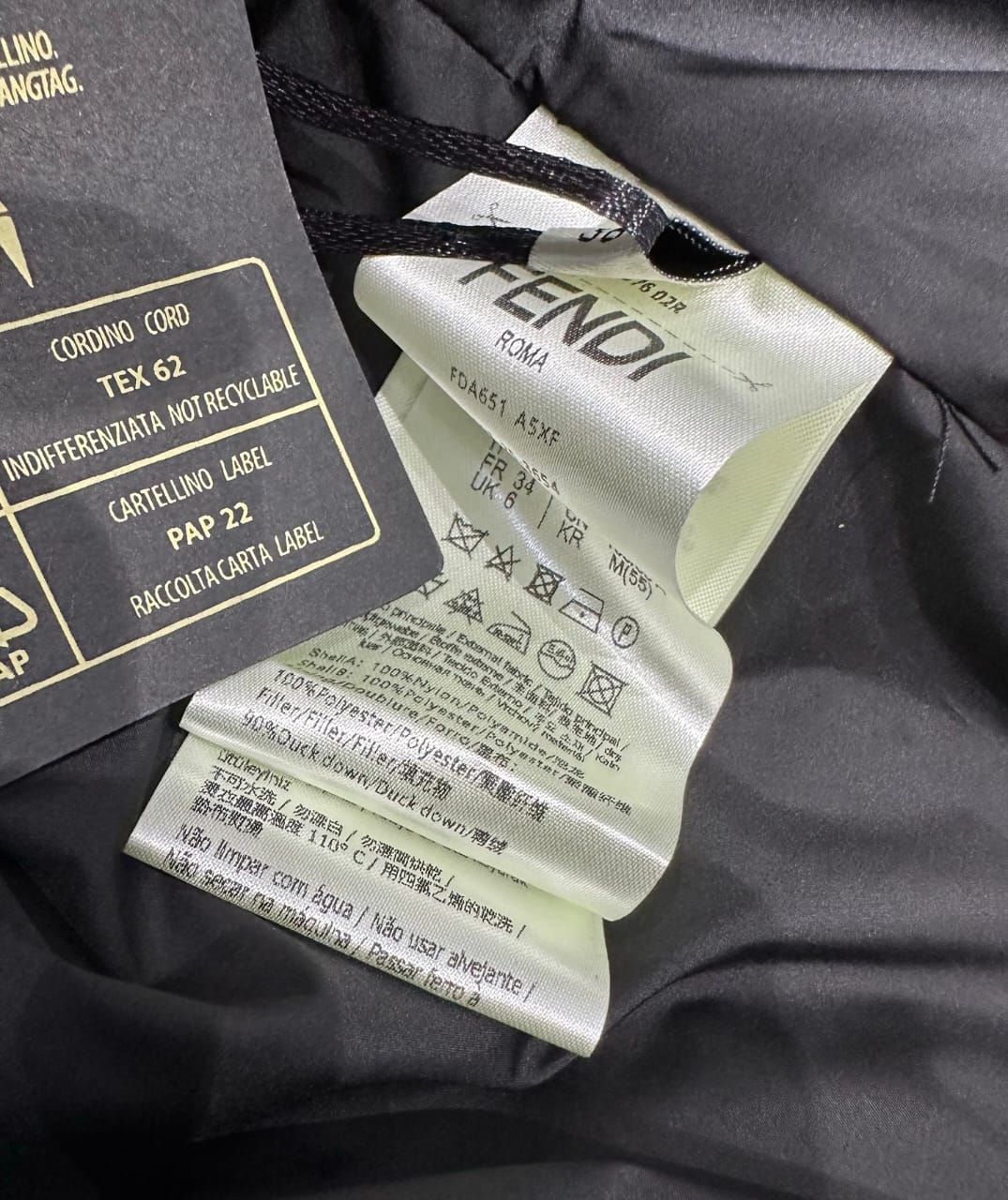 Parka with high collar and drawstring hood. Diagonal pockets and knitted cuffs. Front zip fastening. Made in a shiny jacquard nylon with iconic black FF motif.
