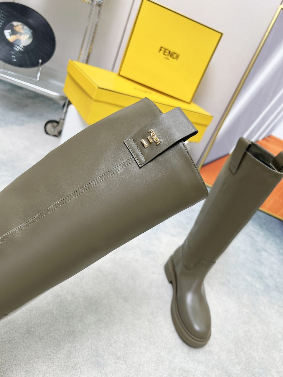 Tubular leg boots with round toe. Made of black leather. Leg made of jacquard fabric with an iconic brown FF motif. Embellished with metal Selleria stitching and metal embossed Fendi Roma lettering. Rubber sole and heel with Fendi lettering on the side. Gold-finish metalware.