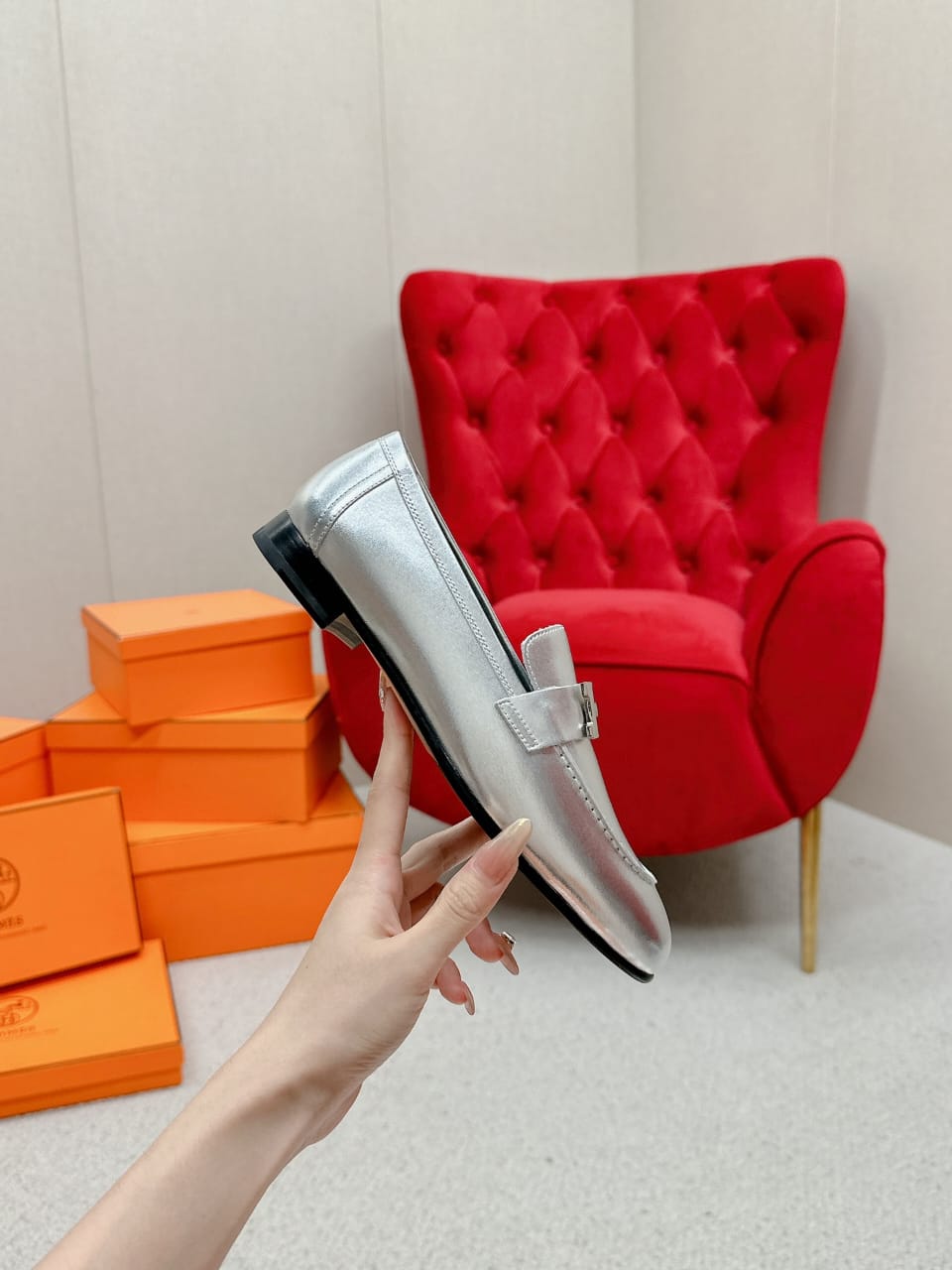 Loafer in goatskin with metallic finish and palladium plated signature "H" detail.