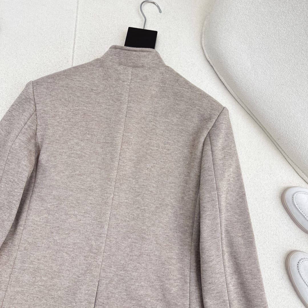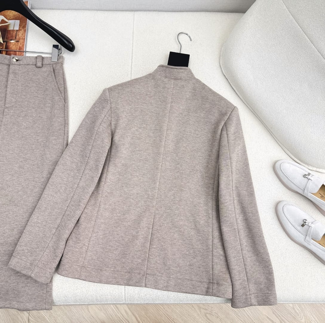 Upright banded collar, a detail borrowed from the Spagna jacket