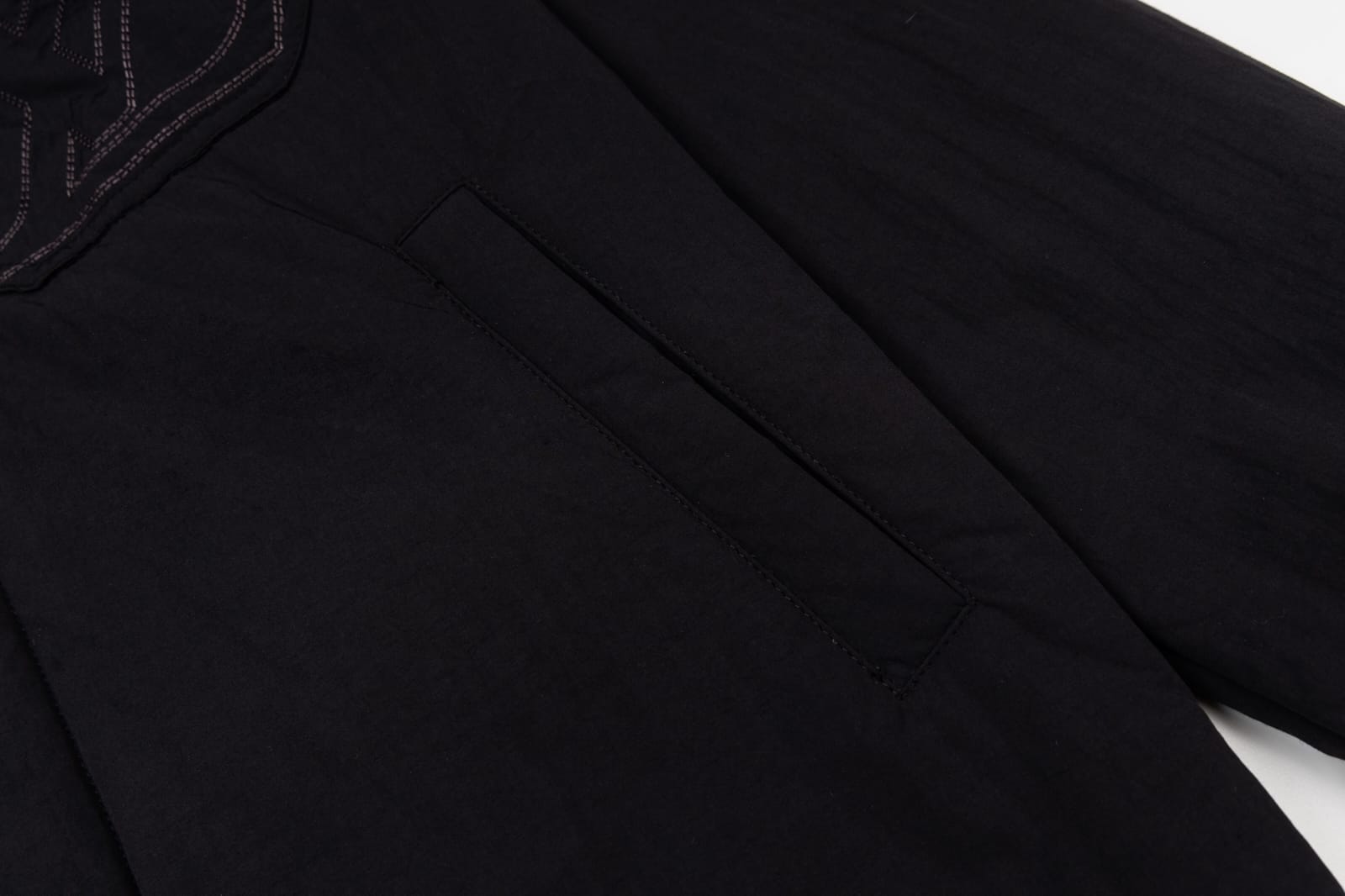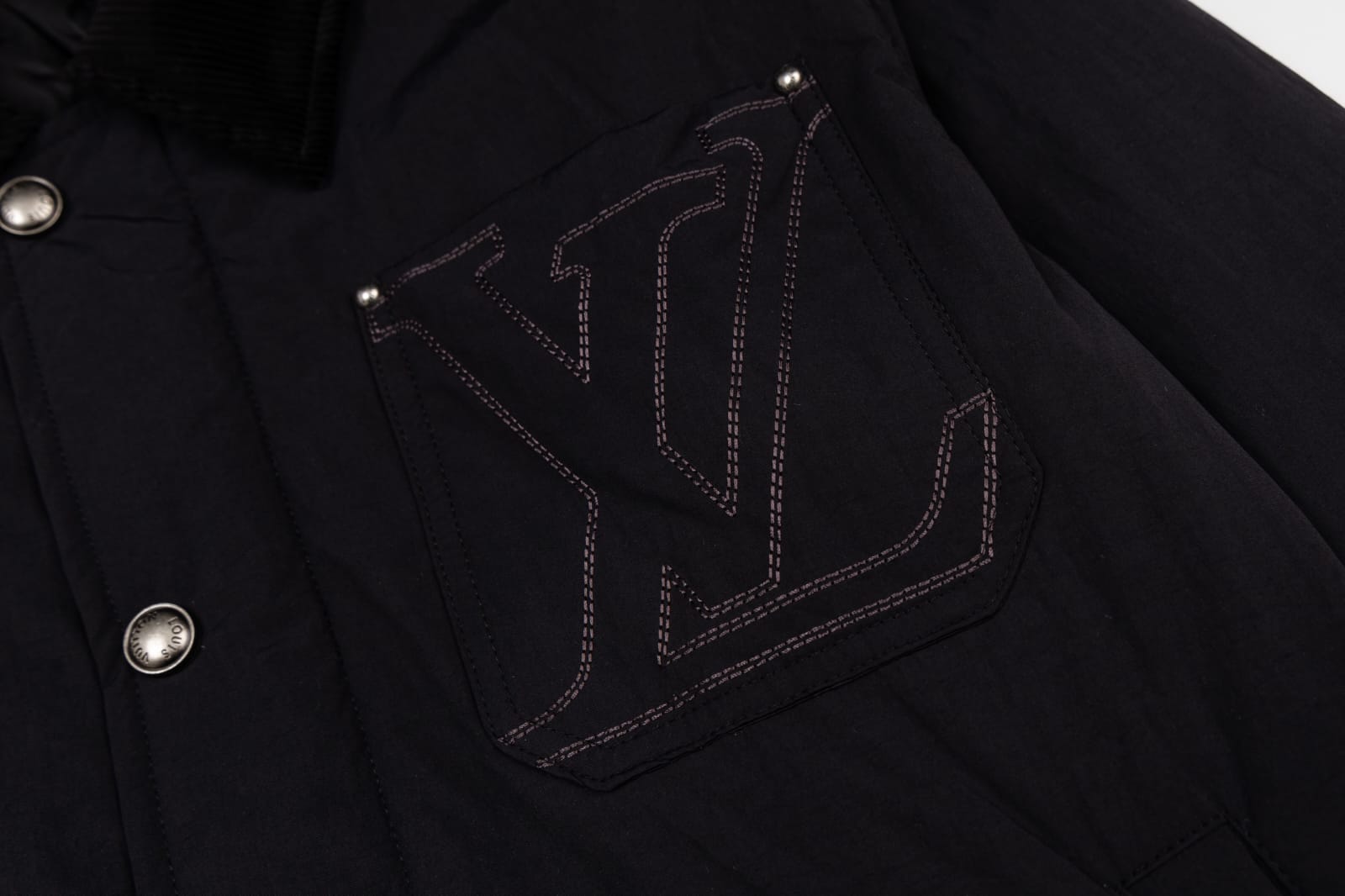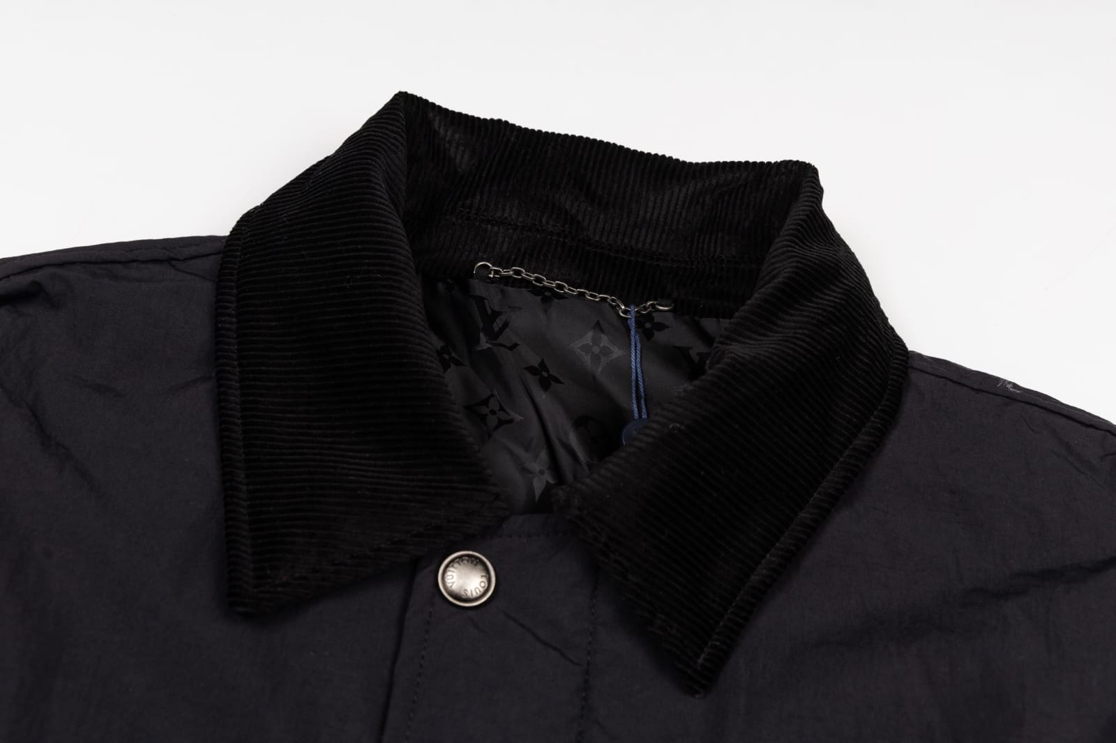 This black workwear jacket with a smart corduroy collar is a timeless piece for all seasons, featuring a water-repellent nylon body and quilted lining. The minimalist silhouette is accented with an embroidered LV on the chest pocket and a leather Marque L.Vuitton Déposée patch on the back. A snap button placket over the zipper accentuates this item's functional elegance.