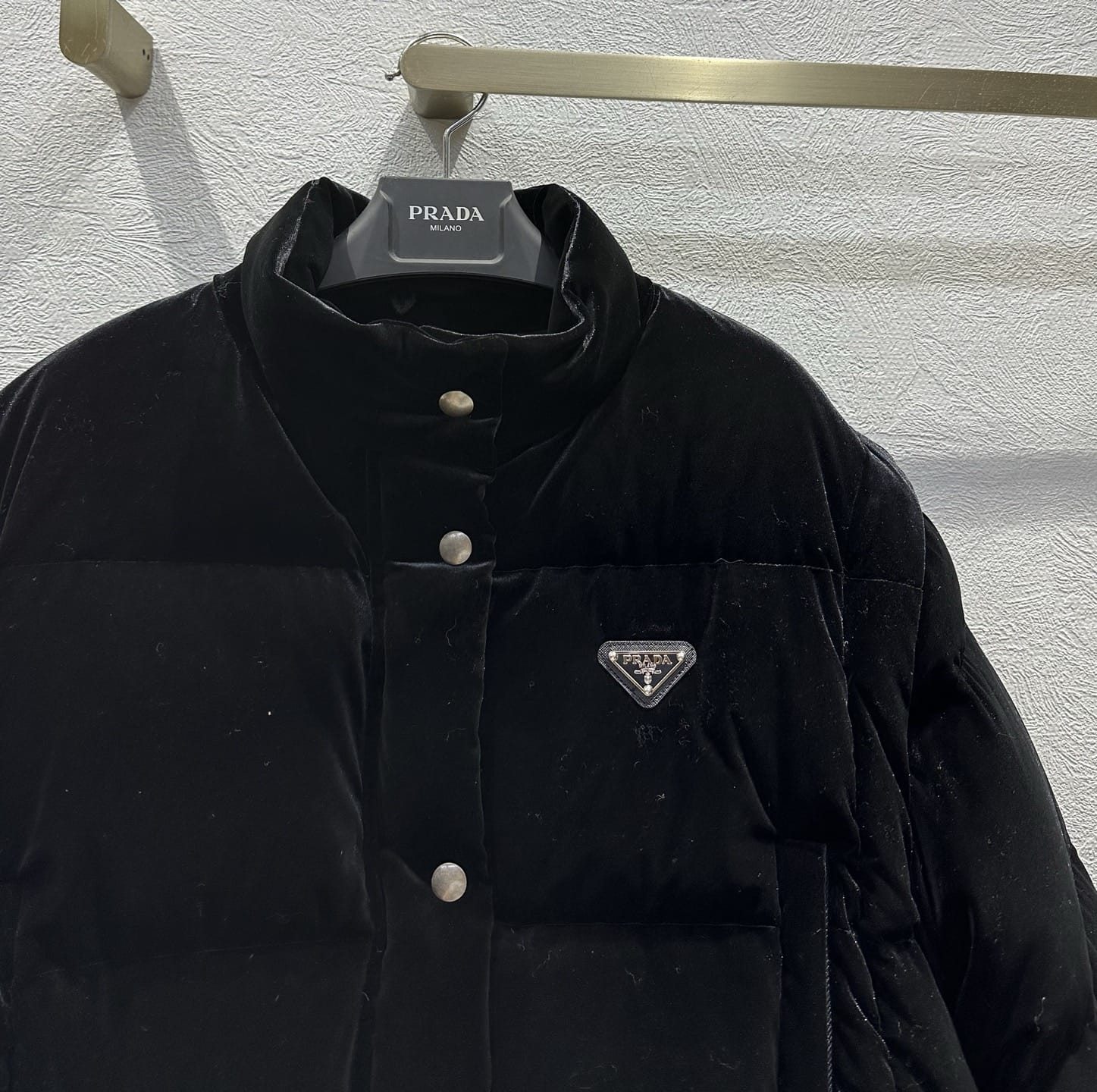 The refined, soft touch of velvet highlights the volumes of this versatile down jacket. Sophisticated notes and sporty details define the garment characterized by detachable sleeves and decorated with the enameled metal triangle logo.